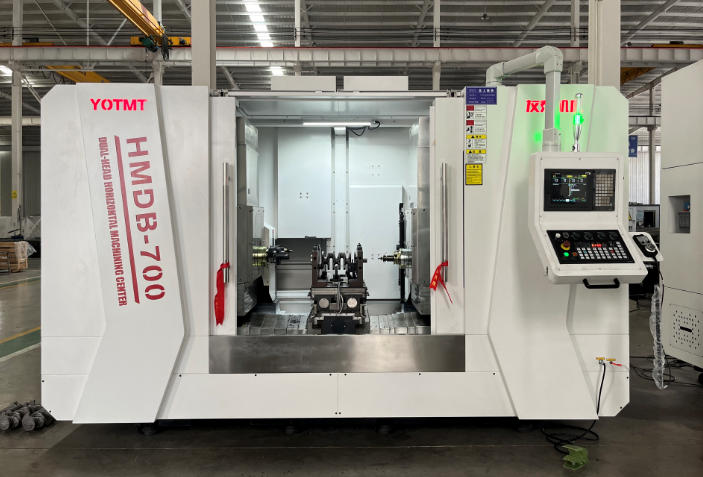 Double-ended spindle design, horizontal spindle box layout, three moving axes on each side, and simultaneous milling and drilling and tapping of two sections of the workpiece.
